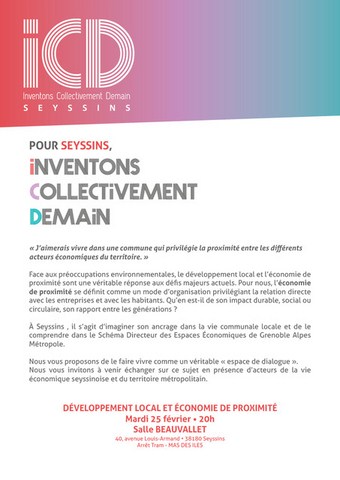 - Le 13 mars : POUR SEYSSINS, INVENTONS COLLECTIVEMENT DEMAIN (Salle Simone Veil)